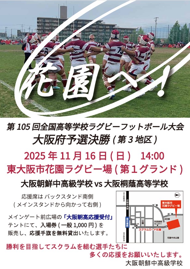 去る11月9日、雨の降る花園ラグビー場第3グラウンドで「第105回全国高等学校ラグビーフットボール大会」大阪府予選・第3地区準決勝が行われ、大阪朝鮮中高級学校が常翔啓光学園を96―0(40―0)で下し、5年ぶりの「花園」に王手をかけました。